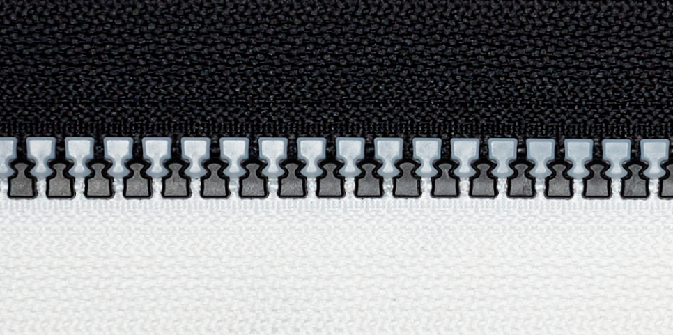 樹(shù)脂拉鏈采用塑料注塑成型的方式生產(chǎn),選用的材料為聚甲醛(POM),本款拉鏈鏈牙顏色與布帶顏色有多種組合方式。