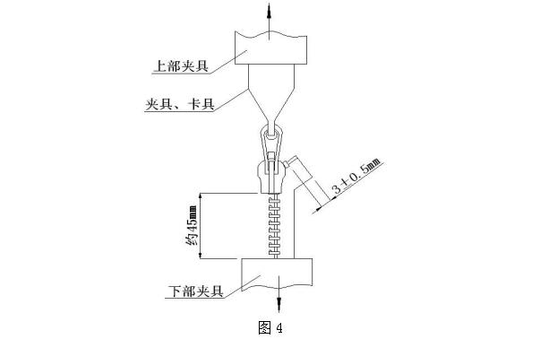 取長(cháng)度大于 50mm 帶拉頭和上止的拉鏈單邊鏈帶樣本一段,將拉鏈的非上止端垂直裝夾在下夾具上,將拉片垂直掛在上夾具掛鉤上或者將拉頭拉片垂直裝夾在上夾具中(如圖 4)。啟動(dòng)測試儀,測試至拉鏈破損或者拉頭拉脫為止,此時(shí)的強力即為單邊上止強力,采用多次測量取有效范圍值。