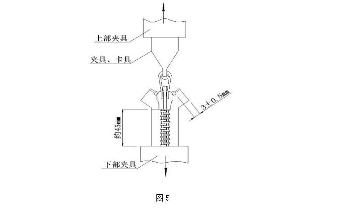 取長(cháng)度大于 50mm 帶拉頭和上止的拉鏈樣本一段,將拉鏈的非上止端垂直裝夾在下夾具上,將拉片垂直掛在上夾具掛鉤上或者將拉頭拉片垂直裝夾在上夾具中(如圖 5)。啟動(dòng)測試儀,測試至拉鏈破損或者拉頭拉脫為止,此時(shí)的強力即為上止強力,采用多次測量取有效范圍值。
