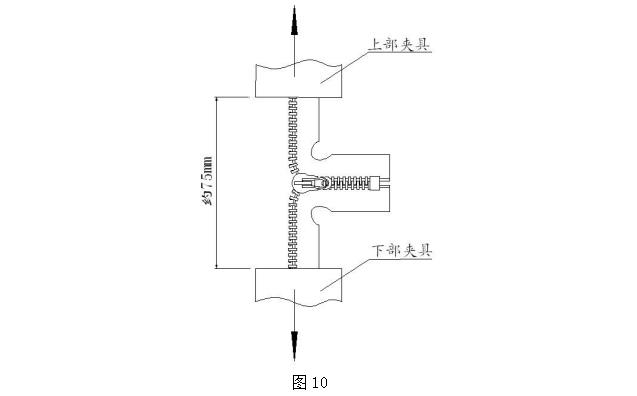 取長(cháng)度大于 100mm 帶自鎖拉頭拉鏈樣本一段,拉頭拉至中間位置,分開(kāi)兩邊鏈帶分別夾于上下夾具中(先去掉一段約 10mm 的鏈牙),夾具距離約 75mm(如圖 10),啟動(dòng)測試儀器,測試至拉頭滑脫或拉鏈破損為止,此時(shí)的強力值即為拉頭自鎖強力,采用多次測試取有效范圍值。