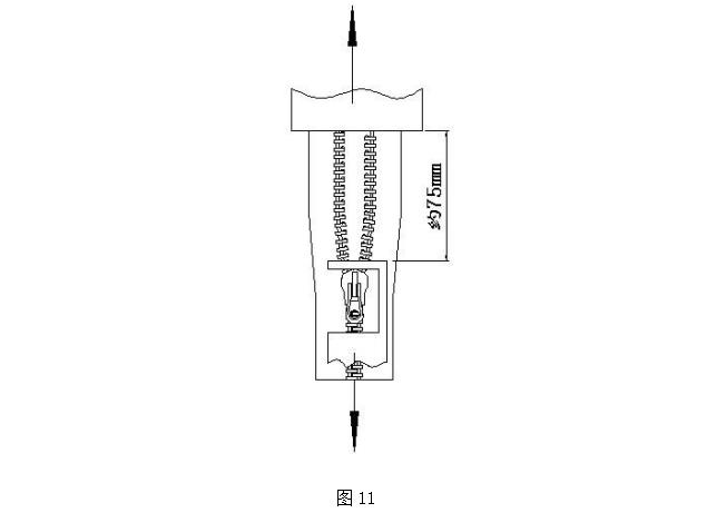 取長(cháng)度大于 100mm 帶自鎖拉頭拉鏈樣本一段,拉頭拉至中間位置,分開(kāi)兩邊鏈帶分別夾于上夾具中(先去掉一段約 10mm 的鏈牙),夾具距離約 75mm(如圖 11),下卡爪夾具卡住拉鏈鏈牙中部并勾住拉頭本體前部(如圖);啟動(dòng)測試儀器,測試至拉頭滑脫或拉鏈破損為止,此時(shí)的強力值即為拉頭自鎖強力,采用多次測試取有效范圍值。