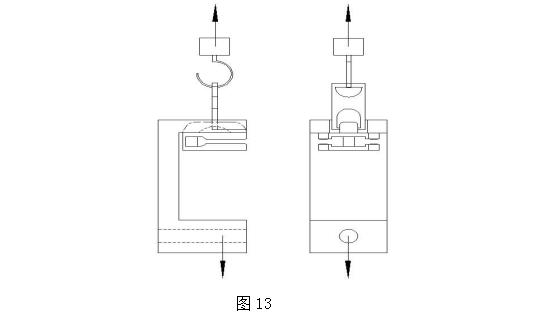 取成品拉頭一個(gè),將拉頭拉片立起掛入上夾具掛鉤中,拉頭本體除蓋帽和拉片橫梁部位外卡入拉頭槽中(如圖 13)。啟動(dòng)測試儀器,測試直至拉片斷裂或者拉頭蓋帽崩裂為止,此時(shí)的強力值即為拉頭拉片結合強力值,采用多次測量取有效范圍值。