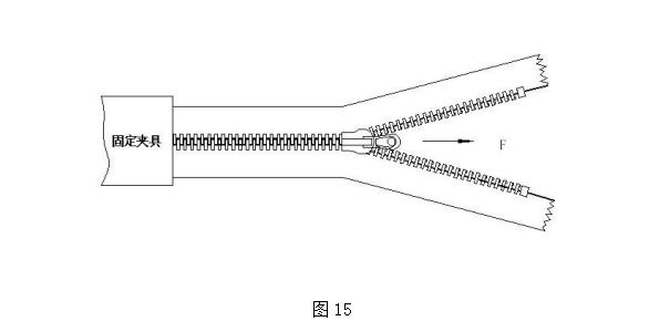 取成品拉鏈一條,任取 200mm 長(cháng)度(長(cháng)度小于 200mm 的按實(shí)際長(cháng)度),用手往復拉動(dòng)三次,然后以拉開(kāi)狀態(tài)置于工作臺上,分開(kāi)端用手推平,另一端裝夾在固定夾具中,拉片套在移位夾具上(如圖 15)。啟動(dòng)測試儀拉合拉鏈至定點(diǎn)位置,在此移動(dòng)過(guò)程中,記錄的最大拉力值即為拉鏈的拉合輕滑度。